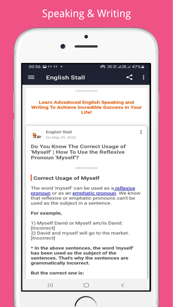 إن تطبيق English Stall هو التطبيق الأكثر فعالية لتعلم اللغة الإنجليزية المتقدمة في الكلام والكتابة والقراءة. يوفر لك الطريقة الأكثر شمولية وفعالية لتعلم اللغة، وهو مصمم بطريقة ستجعل التعلم سهلاً بالنسبة لك.